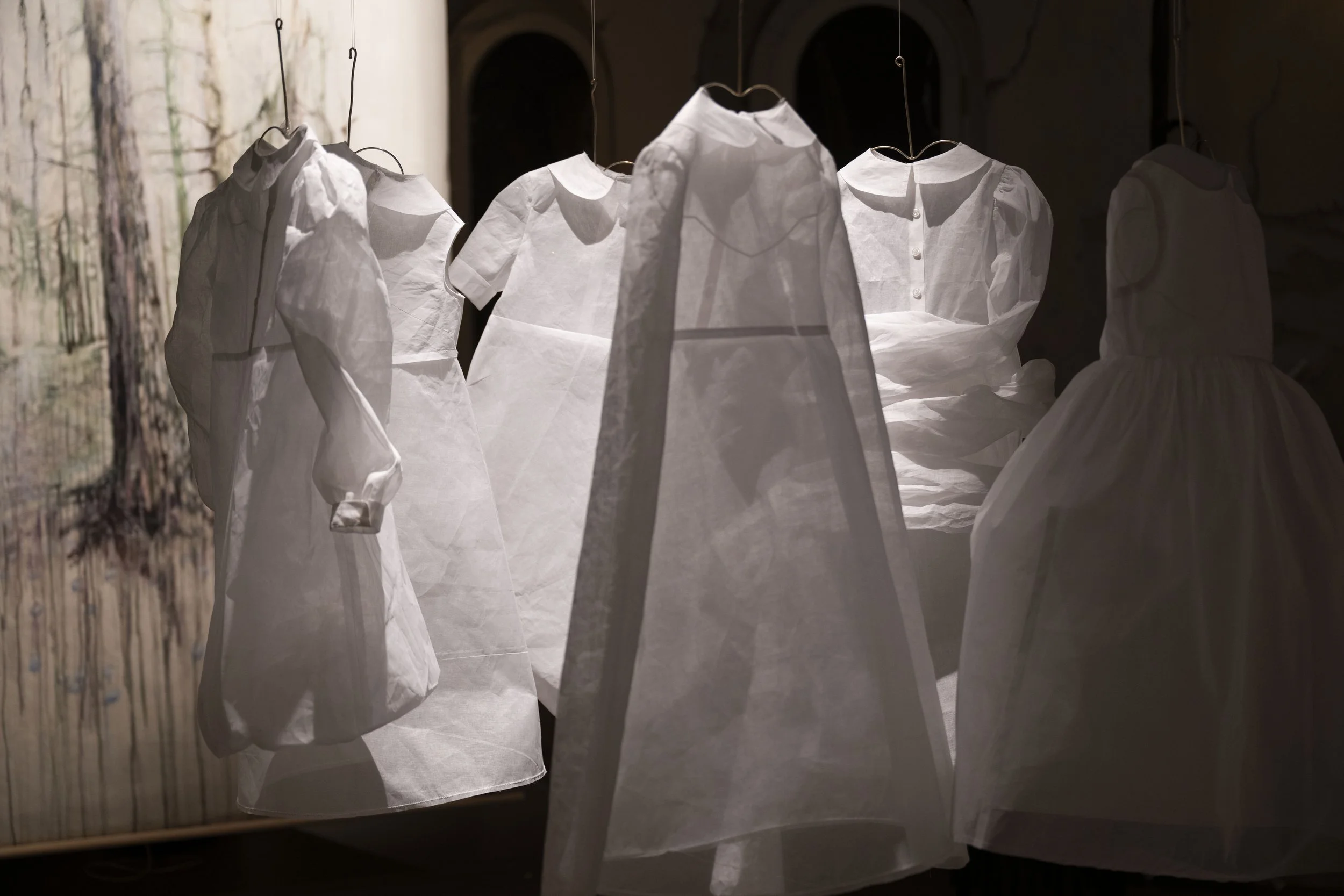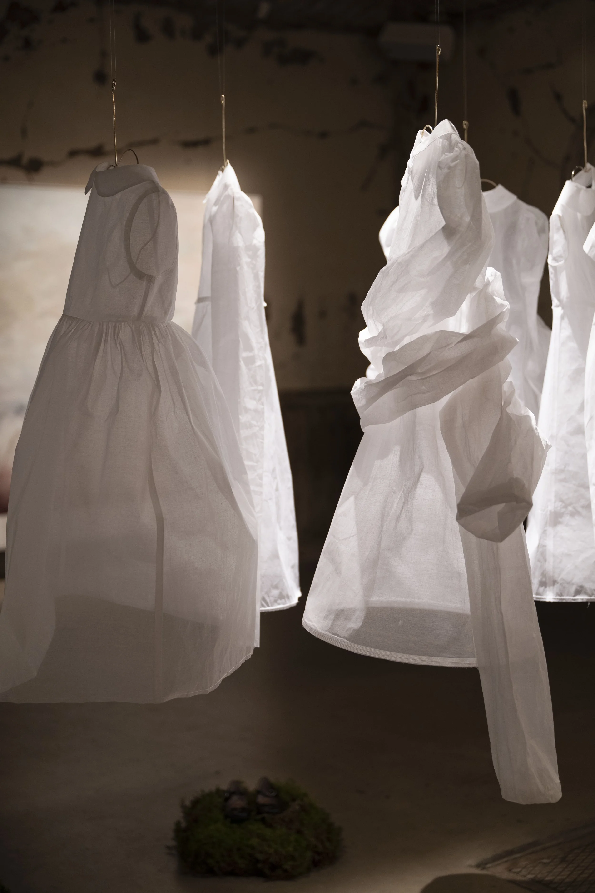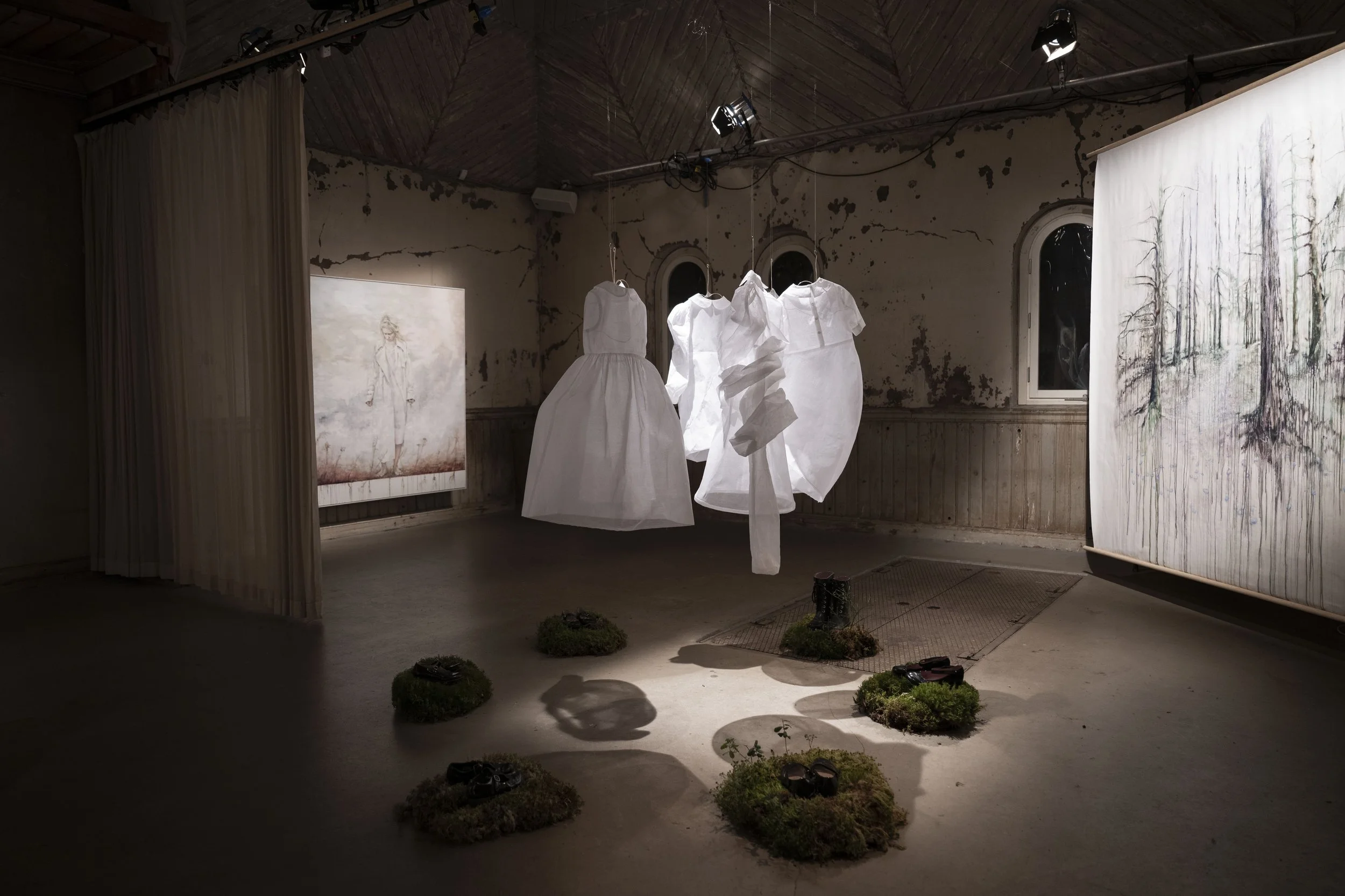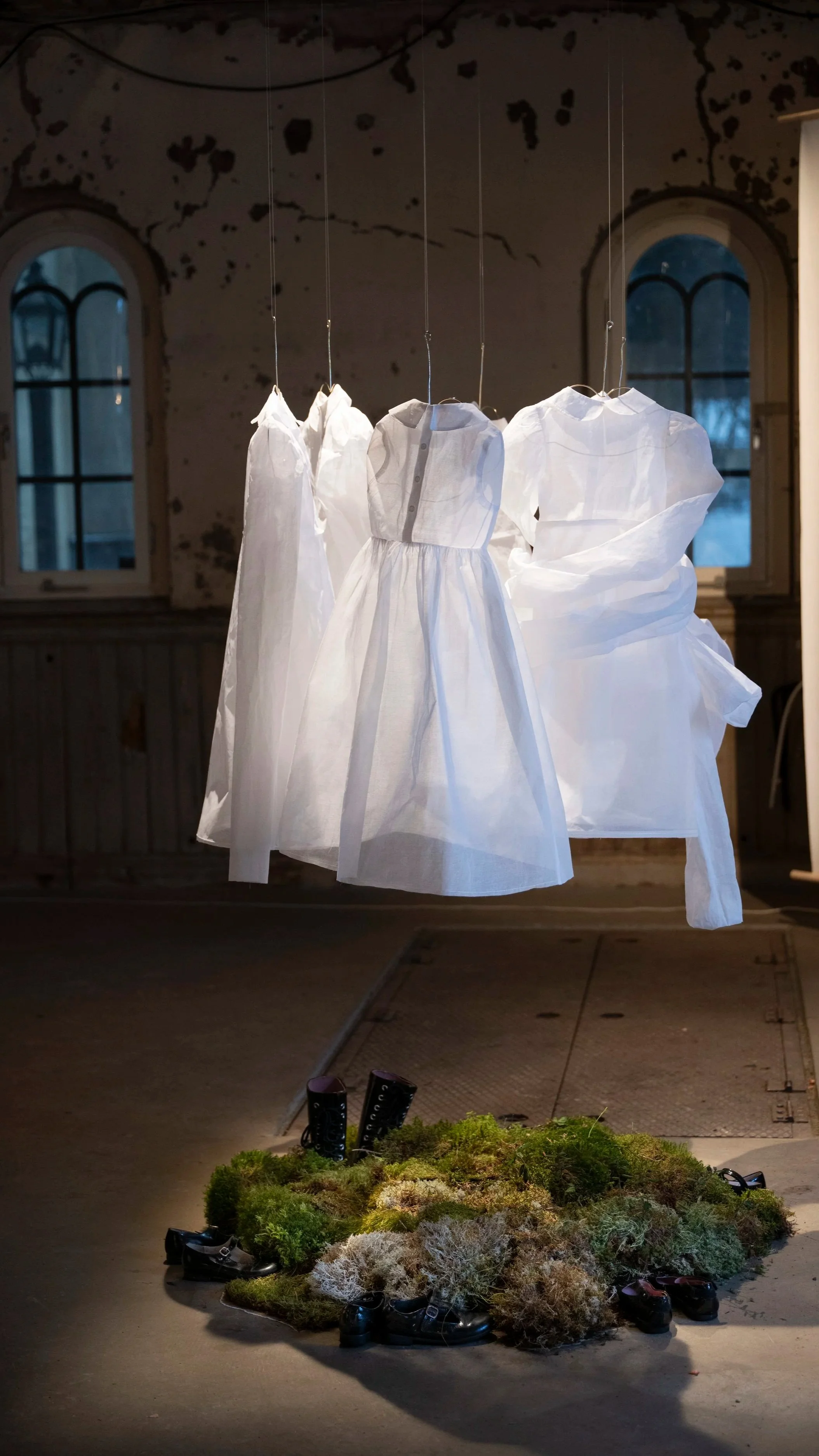 En installation bestående av barnklänningar som alla har ett hinder som är svåra att överbrygga. Ett styck mark med barnskor som påminner om att vi är en del av den.