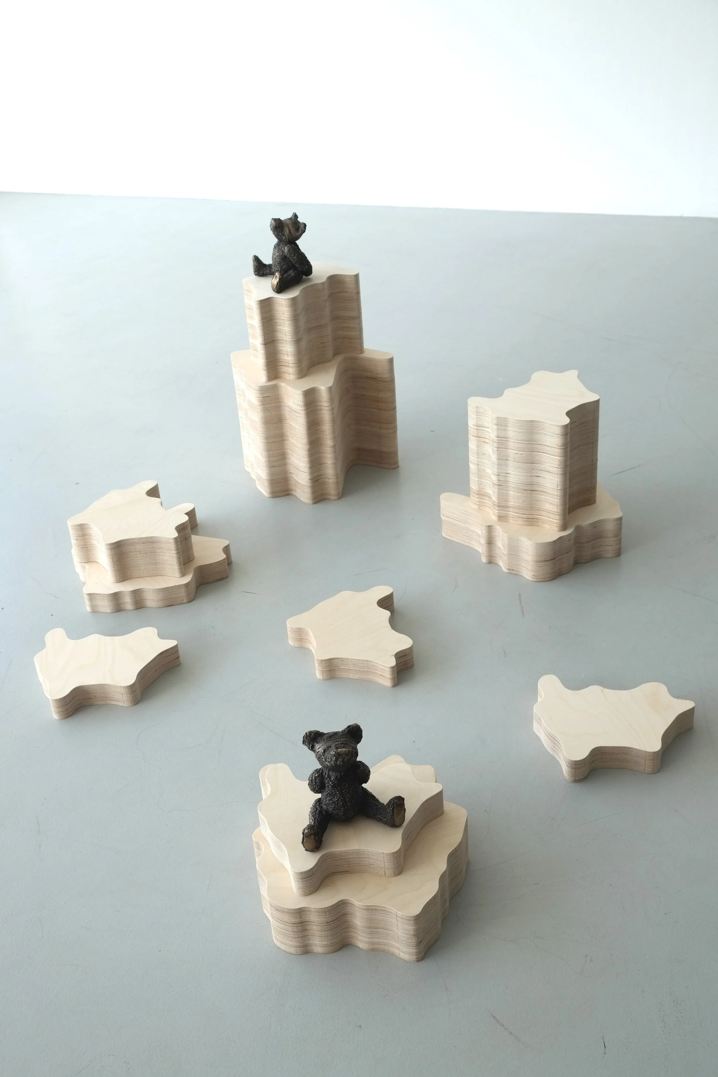 Ispussel, installation med cnc-teknik, skuret trä i storlekarna 26-33 cm