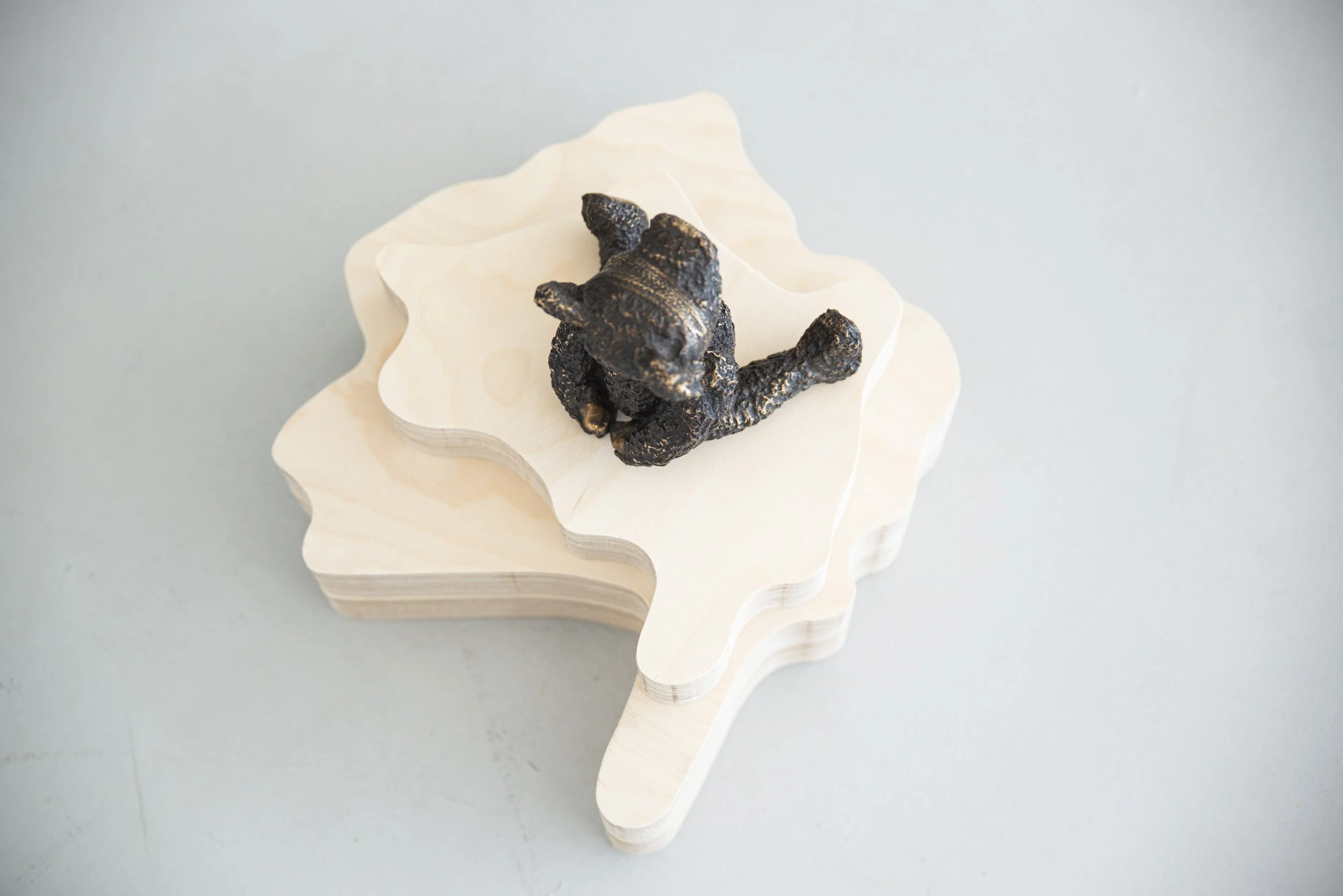 Hassan/Välgöraren bevakar sitt isflak men är bakbunden. Arktis is, en ensam kropp, åt sig själv lämnad. En installation över skillnaden på isens utbredning sommaren 2019 och meridianen på isens utbredning 1981-2010 på Arktis. Hassan, skulptur i upplaga, brons, h 13 cm